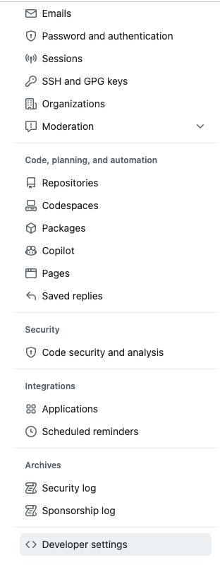 settings을 누르면 좌측에 긴 메뉴가 생기는데 맨 밑에 Developer settings을 눌러준다