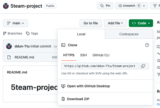 여기서 중요한 부분은 [https://github.com/닉네임/저장소이름.git]로 되어있는데