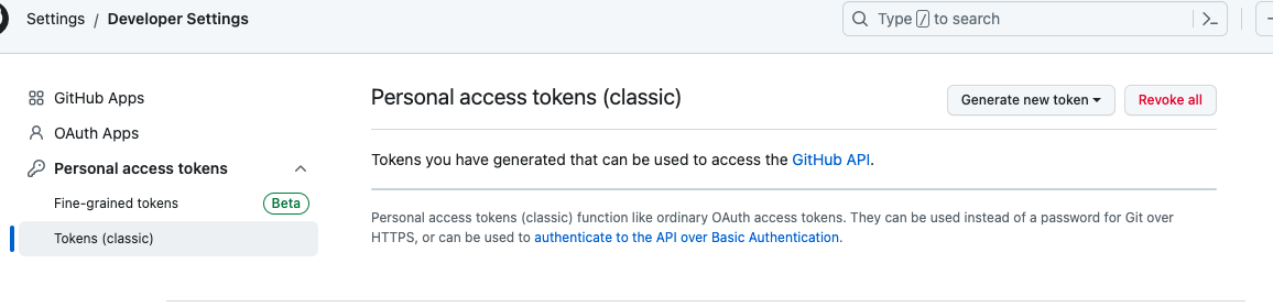 오른쪽에 Generate new token을 누르면 두 개가 뜨는 데 아래 Generate new token(classic)을 눌러준다.