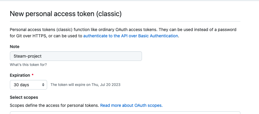 Select scopes는 repo만 체크해주시면 됩니다.