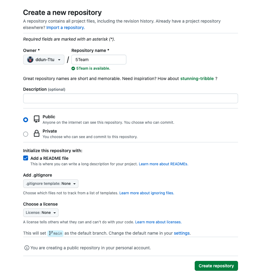 이때 repository name만 필수로 작성해주며, 공개 등 설정은 자유롭게 해준다
