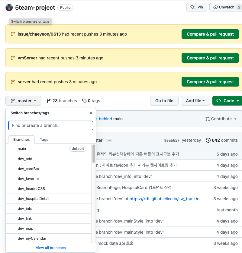 이때 깃허브는 기본 브랜치가 main 브랜치로 잡혀있기 때문에 업데이트가 안 된 것처럼 보일 수 있습니다.